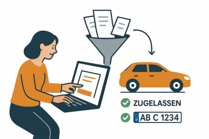 Alle Angaben und Unterlagen werden digital eingereicht, die Zulassungsstelle aktualisiert das Register und stellt dir die Bestätigungen für Versicherung und Kfz-Steuer zur Verfügung.